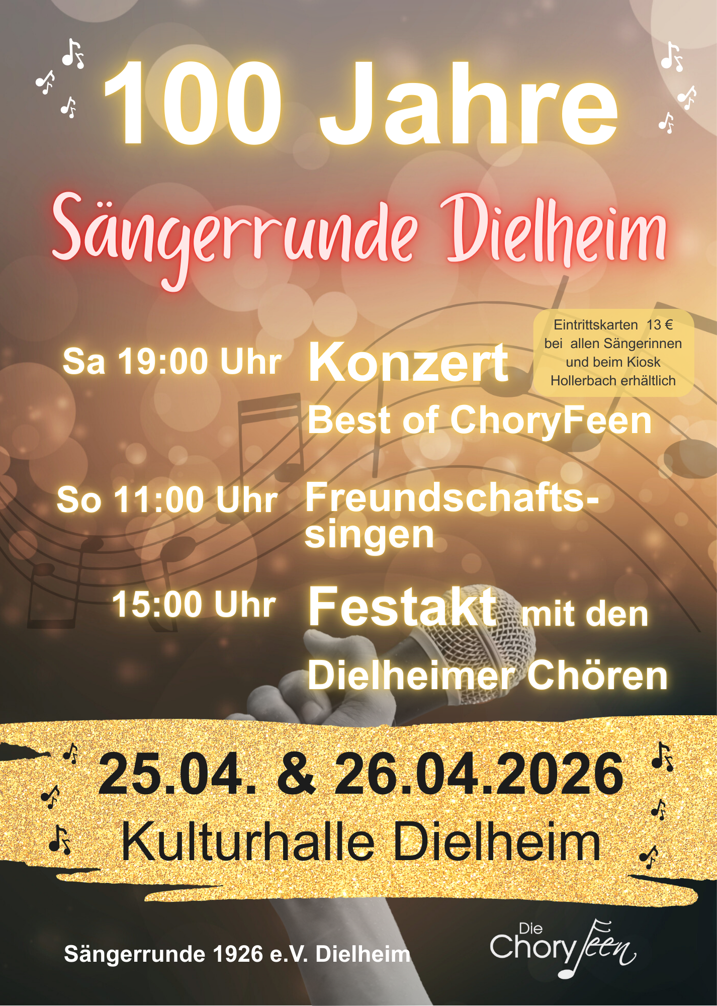 Die Sängerrunde 1926 e.V. Dielheim feiert 2026 ihr 100-jähriges Jubiläum. Neben einem Konzert "Best off ChoryFeen" wird es auch voraussichtlich ein Freundschaftssingen geben.